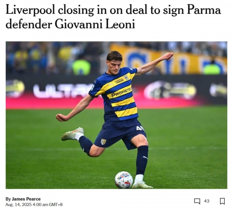 8月14日最新消息,据The Athletic知名记者James Pearce透露,红军即将以2600万英镑(折合3016万欧元)的基础转会费引进帕尔马新星莱奥尼。